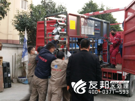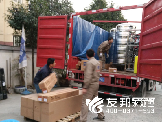 師傅們正在裝車發(fā)貨的是鄭州友邦生產(chǎn)的型號為YB-CJS-002的2噸純凈水設(shè)備。這套設(shè)備是用在鄭州高新區(qū)機械廠的生產(chǎn)用水。