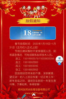 春節(jié)放假時(shí)間為:2020年1月19日至2020年1月31日,2020年2月1日正式上班,請(qǐng)大家提前安排好時(shí)間!按時(shí)返回上班。