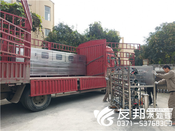 查看詳情>>即將裝車發(fā)貨的是一套5噸雙級純凈水設(shè)備。此套設(shè)備發(fā)往洛陽,采購此套設(shè)備的廠家已經(jīng)和友邦合作多年。廠房擴(kuò)建升級,客戶依然選擇了友邦。鄭州友邦創(chuàng)始于2003年,18年水處理設(shè)備經(jīng)驗,設(shè)備運行成本低,出水穩(wěn)定,不錯的選擇。